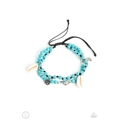 A coastal collection of silver cubes marbled turquoise beads, cowrie shells, silver discs, and hammered silver beads slide along a shiny black cord around the ankle for a whimsical look. Features an adjustable sliding knot closure.
