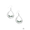 A glittery cluster of emerald green rhinestones is sprinkled across the bottom of a hammered silver spade-like frame, resulting in a radiant sparkle. Earring attaches to a standard fishhook fitting.