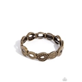 Thick abstract brass teardrops, abstract hammered ovals, aurum rhinestone-encrusted teardrops, and airy brass ovals alternate with stacked brass studs around an elastic stretchy band, creating a timeless staple around the wrist.