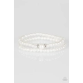 Dainty white pearls are threaded along stretchy elastic bands, creating a pair of refined bracelets. Encrusted in glittery white rhinestones, sparkling rings flank a larger white pearl, creating an elegant centerpiece atop the wrist