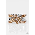 Encrusted in glittery rhinestones, shimmery silver bars crisscross across the finger, coalescing into a bold square knot atop the finger. Features a stretchy band for a flexible fit.