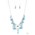 Pearly white pebbles and an assortment of blue crystal-like beads trickle from two silver chains, creating a prismatically layered look below the collar. Features an adjustable clasp closure.