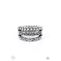 Three silver bands, embellished with floral motifs, stack into an airy display atop the finger. Features a stretchy band for a flexible fit.