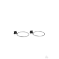 A twisted and textured silver oversized hoop, swings from the bottom of a silver-studded square frame, tilted on its point, with a black stone pressed in its center. The two rustic pieces cascade down the ear for a free-spirited finish, with eye-catching movement. Earring attaches to a standard post fitting. As the stone elements in this piece are natural, some color variation is normal.
