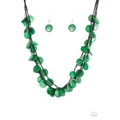 Tinted in a green finish, shiny wooden discs trickle along shiny black cording, creating three colorful layers below the collar. Features a button-loop closure.