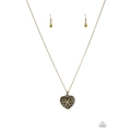 Encrusted in glittery green rhinestones, a vintage inspired heart pendant swings from the bottom of a shimmery brass chain for a romantic fashion. Features an adjustable clasp closure.