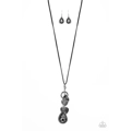 Dangling from the bottom of an elongated black suede string, a lobster clasp closure holds an eclectic collection of shimmer and shine. Featured on the lobster clasp, varying sizes of white teardrop gems pressed into silver studded frames, varying sizes of silver hearts brushed in an antiqued pattern, and a ring brushed in a cobblestone-like pattern create a whimsical refinement down the neckline. Features an adjustable clasp closure.