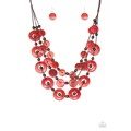 Brushed in a shell-like iridescence, fiery red wooden discs and round brown wooden beads are knotted along three strands of brown cording for a summery look. Features a button loop closure.
