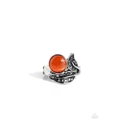 Hematite rhinestone encrusted silver leaf frames delicately gather around a dreamy orange cat's eye stone, resulting in an ethereal centerpiece atop the finger. Features a dainty stretchy band for a flexible fit.