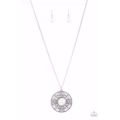 A glowing white cat's eye stone is pressed into the center of an airy circular frame flowering with fleur de lis-like accents, creating an enchanting pendant at the bottom of a lengthened silver chain. Features an adjustable clasp closure.