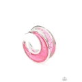 Flecked in silver shavings, a glistening pink acrylic half moon frame is bordered with flat shiny bars that coalesce into a curvaceous hoop. Earring attaches to a standard post fitting. Hoop measures approximately 2" in diameter.