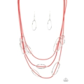 An asymmetrical collection of hammered silver ovals are fitted in place along three rows of shiny red cords, creating an edgy display below the collar. Features an adjustable clasp closure.