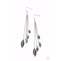A collection of textured antiqued silver leaflets accented with dewdrop opal rhinestones, swing from delicate silver chains creating a tranquil chime as it falls from the ear. Earring attaches to a standard fishhook fitting.