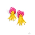 Dainty, hot pink tulle ribbon arranges into a beautiful floral centerpiece, giving way to copious strands of bright yellow seed beads for a fairytale-inspired look. Bright white seed beads cap each end of the yellow beaded strands for a final flourish of color. Earring attaches to a standard post fitting.