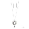 Featuring hammered finishes, two asymmetrical silver rings dangle from the bottom of a lengthened silver chain for a rustic look. A lobster clasp hangs from the bottom of the design to allow a name badge or other item to be attached. Features an adjustable clasp closure.