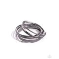 A collection of smooth and textured bangles gives off a sassy chiming melody and makes a dramatic impact as the bright, shimmering silver and gunmetal surfaces stack up the wrist.