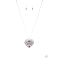 Dotted with glittery red rhinestones, an oversized heart frame radiating with glistening filigree detail swings from the bottom of a lengthened silver chain for a vintage inspired look. Features an adjustable clasp closure.