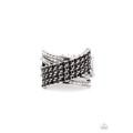 Glittery black rhinestones dot dainty sections of silver chain that slant across rows of white rhinestone encrusted bands, coalescing into an edgy centerpiece. Features a stretchy band for a flexible fit.