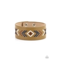 Blue, brown, and white thread is stitched across the front of a Willow leather band, creating a colorful tribal inspired pattern. Features an adjustable snap closure.