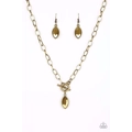 Featuring a regal marquise style cut, a glittery aurum rhinestone swings from the bottom of a brass chain below the collar for a classic look. Features a toggle closure.