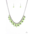 Featuring round and teardrop styles, refreshing green and faceted silver beads swing from the bottoms of interlocking silver chains, creating a bold fringe below the collar. Features an adjustable clasp closure.