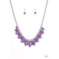 Featuring round and teardrop styles, vivacious purple and faceted silver beads swing from the bottoms of interlocking silver chains, creating a bold fringe below the collar. Features an adjustable clasp closure.