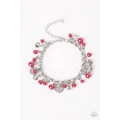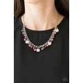 Pearly red beads, smoky crystal-like gems, and hammered silver discs swing from a bold silver chain, creating a refined fringe below the collar. Features an adjustable clasp closure.