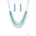 Mismatched silver chains layer below the collar for a bold industrial look. Painted in a refreshing finish, a shiny blue chain drapes between the shimmery silver chains for a vivacious finish. Features an adjustable clasp closure.
