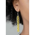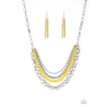 Mismatched silver chains layer below the collar for a bold industrial look. Painted in a flashy finish, a shiny yellow chain drapes between the shimmery silver chains for a vivacious finish. Features an adjustable clasp closure.