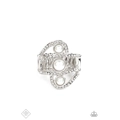 Layers of sparkly rhinestone-encrusted bands swirl and wrap around a stacked trio of polished pearly white beads, creating an elegant centerpiece atop the finger. Features a stretchy band for a flexible fit.