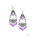 Infused with hints of glittery white rhinestones, dotted silver filigree swirls into a decorative frame. Polished purple beads swing from the bottom and top of the ornate frame, adding colorful movement to the whimsical piece. Earring attaches to a standard fishhook fitting.
