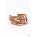 Dainty red wooden beads and classic silver beads are threaded along strands of brown suede, creating colorful layers across the wrist. Features an adjustable clasp closure.