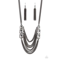Layers of thick, gunmetal curb chain drape across the chest, creating a fierce, industrial statement piece. Three blinding white, emerald-cut gems that gradually increase in size, are affixed to each side of the swooping chains, adding dramatic sparkle to the collision of grit and glitz. Features an adjustable clasp closure.