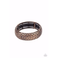 Hammered in rustic textures, curved copper rectangular frames are threaded along stretchy bands around the wrist for an artisan inspired look.