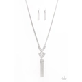 Two airy geometric silver frames link at the bottom of a lengthened silver chain, creating a stacked pendant. Rectangular bars swing from the bottom of the pendant, adding a bold movement to the tribal inspired piece. Features an adjustable clasp closure.