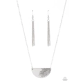 Suspended between the center of a dainty silver chain, a glistening silver half moon plate is stamped in an antiqued palm leaf for a seasonal flair. Features an adjustable clasp closure.