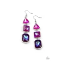 Featuring an iridescent UV shimmer, a trio of pink, purple, and blue geometrically shaped gems are pressed into silver frames that link together and culminate in a cosmically stellar lure. Earring attaches to a standard fishhook fitting.