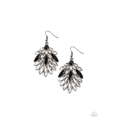 A glassy white teardrop rhinestone gives way to a sparkly fan of white and black oblong marquise cut rhinestones, coalescing into an out-of-this-world statement piece. Earring attaches to a standard fishhook fitting. Sold as one pair of earrings.
