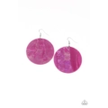 Brushed in a rainbow iridescence, a circular pink acrylic frame swings from the ear for an out of this world style. Earring attaches to a standard fishhook fitting. Color may vary.