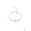 Encased in a glassy fitting, a whimsical white daisy centerpiece attaches to two arcing silver bars around the wrist for an enchanting floral look. Features an adjustable clasp closure.