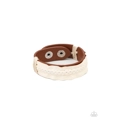 Featuring tactile stitching down the center, a white piece of vinyl-like leather is knotted in place across the front of a brown leather band, creating a one-of-a-kind centerpiece around the wrist. Features an adjustable snap closure.