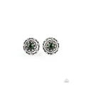 A glittery green rhinestone dots the center of a shimmery silver frame swirling with regal filigree detail for a refined look. Earring attaches to a standard post fitting.