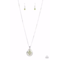 Dainty green and opal rhinestones sparkle at the center of a silver teardrop pendant. Dotted in a subtle floral trim, the whimsical frame glides along a shiny silver chain below the collar for a seasonal look. Features an adjustable clasp closure.