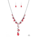 Mismatched polished red beads, crystal-like beads, and faceted silver beads dance along a shimmery silver chain. Matching beading trickles along a single silver chain, creating a romantic extended pendant below the collar. Features an adjustable clasp closure.