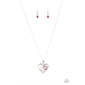 A red rhinestone encrusted heart intertwines with a plain silver heart inside of a larger silver heart frame, creating a romantic pendant at the bottom of a shimmery silver chain. Features an adjustable clasp closure.