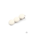 A trio of knitted white button-top frames embellishes the front of a classic silver frame, creating a playful pop of color. Features a standard hair clip on the back.