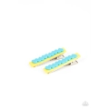 A row of blue hearts alternate across the front of a yellow rectangular frame, creating a charming pair of flirtatious hair clips. Features standard hair clips on the back.