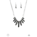 Pairs of glittery white rhinestones alternate between flared gunmetal rods that are threaded along two rows of flat gunmetal chains, creating a dangerously dazzling fringe below the collar. Features an adjustable clasp closure.