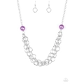 Two oversized purple pearls give way to dramatic silver chains, creating bold layers below the collar for a sassy look. Features an adjustable clasp closure.