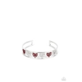Glimmering in the center of an airy silver cuff, a row of hearts seemingly floats inside sleek silver borders that line them above and below. Each heart is encrusted with glittery white and siam rhinestones, adding additional bling to this love-inspired cuff as it wraps around the wrist.